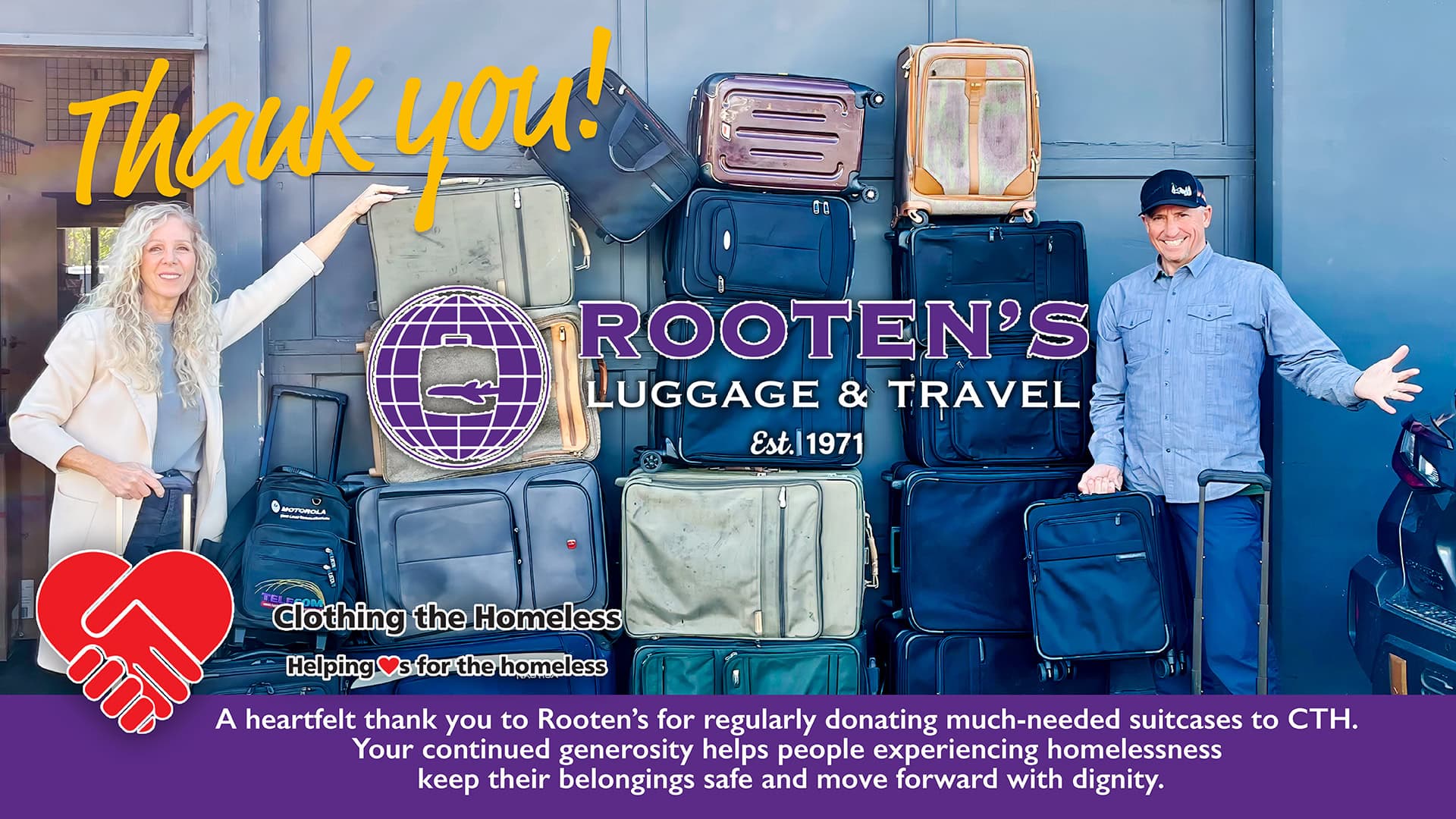 Rooten's Luggage and Travel has been a proud sponsor of CTH for many years. They have continuously generously donated luggage and backpacks to help the homeless carry their belongings. Thank you Rooten's!